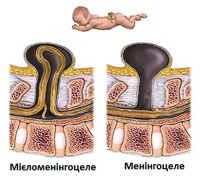 - Менінгоцеле. При цій рідкісній формі оболонки спинного мозку виступають через отвір в хребцях. Оскільки спинний мозок розвивається нормально, виступаючі оболонки можна видалити хірургічним шляхом.