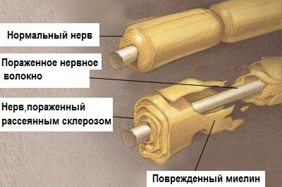 Миелин можно сравнить с изоляцией на электрических кабелях. Когда повреждается слой миелина, передача импульсов, которые идут по этому нерву, может быть замедлена или заблокирована.