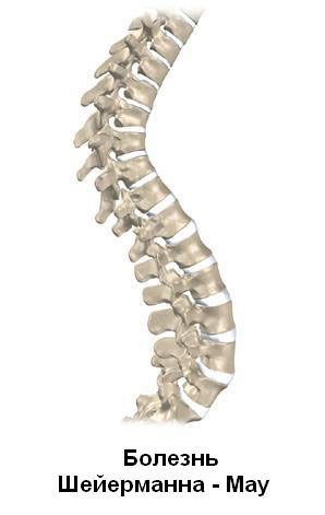Кифоз Шейерманна. Как и постуральный кифоз, кифоз Шейермана обычно развивается у подростков в возрасте 10-15 лет, пока кости находятся в процессе роста. Данный кифоз также называется болезнью Шейермана-Мау, он встречается в два раза чаще у мальчиков, чем у девочек. При болезни Шейермана-Мау позвонки деформируются таким образом, что на рентгеновских снимках они выглядят клиновидными, а не треугольными. На пораженных позвонках также могут развиться грыжи Шморля. Эти грыжи появляются в результате продавливания подушки (диска), расположенной между позвонками, в кость в нижней и верхней части позвонка.